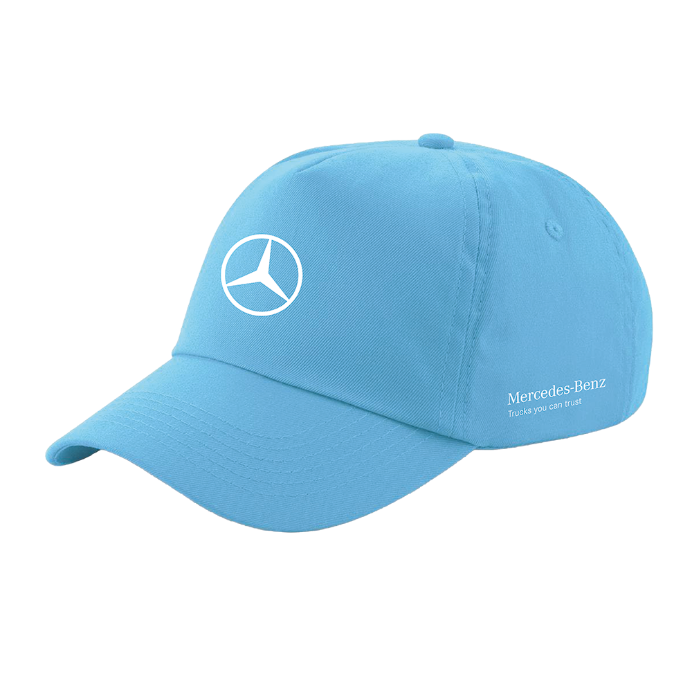 Blaue 5-Panel-Kappe mit weißem Mercedes-Benz Stern auf der Vorderseite, 130 Years Trucks-Schriftzug auf der einen Seite und dem Mercedes-Benz Trucks-Schriftzug auf der anderen Seite. Material: 100 % Baumwolltwill Größe: verstellbar.