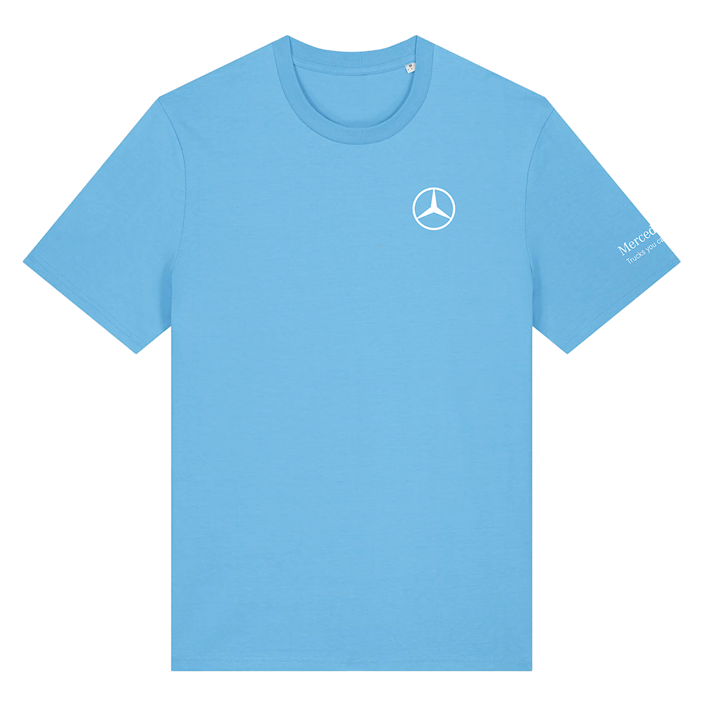 Blaues T-Shirt mit einer „130 Years Trucks“-Grafik auf der Rückseite, dem Mercedes-Benz Trucks-Schriftzug auf dem linken Arm und dem Stern auf der linken Brust. Material: 100 % Bio-Baumwolle.